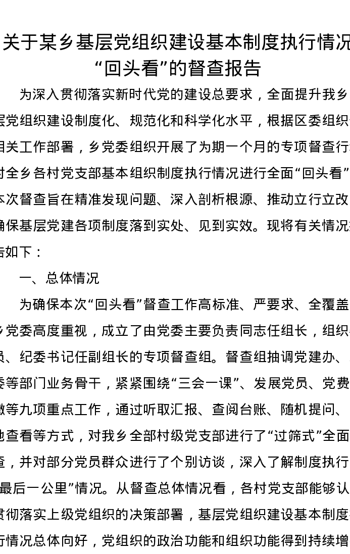 关于某乡基层党组织建设基本制度执行情况“回头看”的督查报告