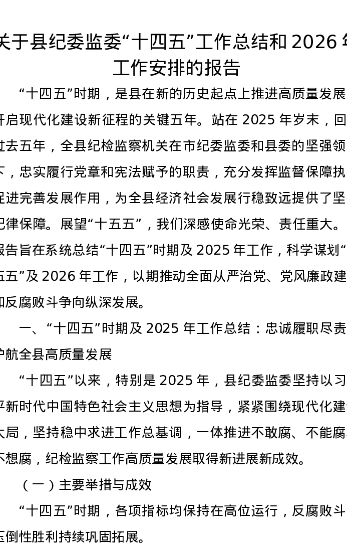 关于县纪委监委“十四五”工作总结和2026年工作安排的报告