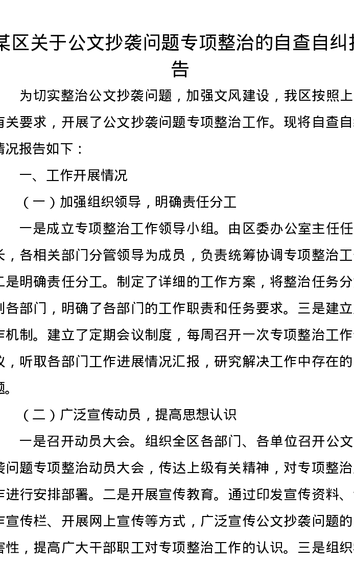 某区关于公文抄袭问题专项整治的自查自纠报告