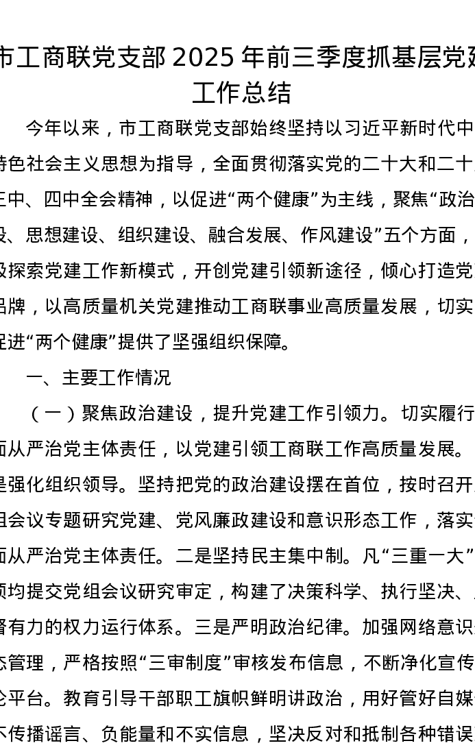 市工商联党支部2025年前三季度抓基层党建工作总结