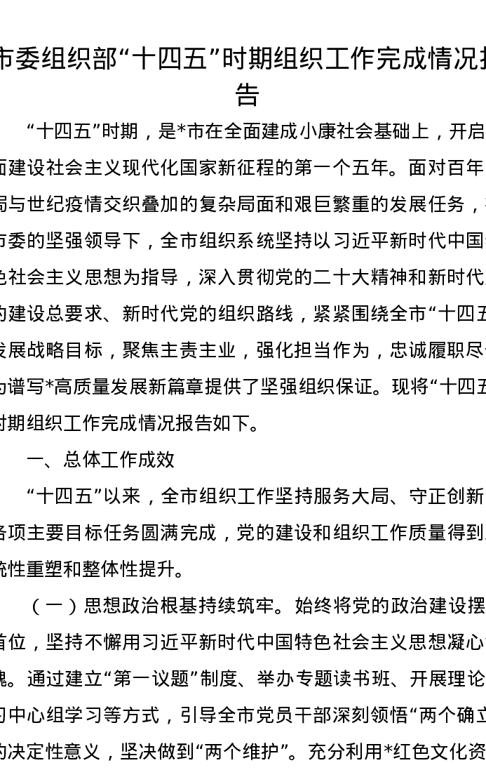 市委组织部“十四五”时期组织工作完成情况报告