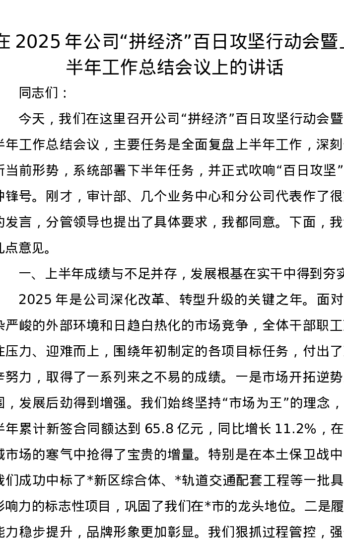 在2025年公司“拼经济”百日攻坚行动会暨上半年工作总结会议上的讲话