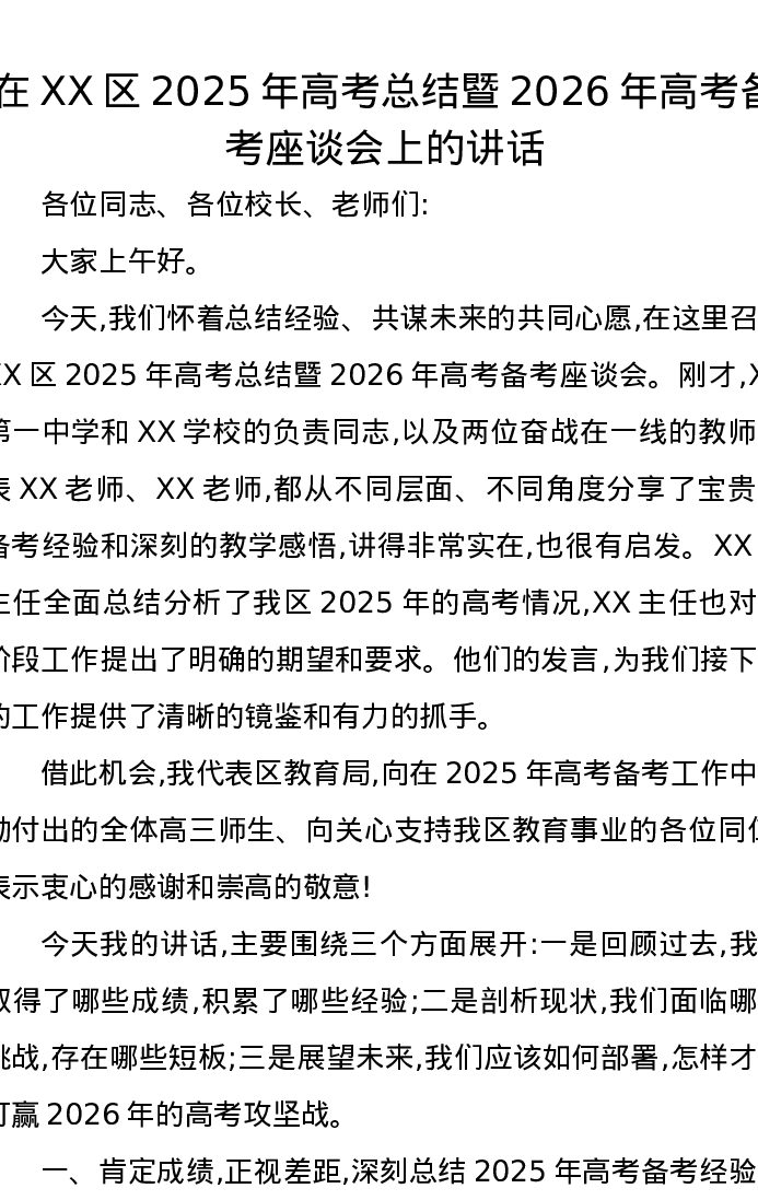 在XX区2025年高考总结暨2026年高考备考座谈会上的讲话