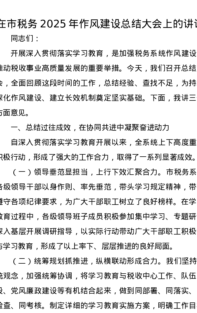 在市税务2025年作风建设总结大会上的讲话