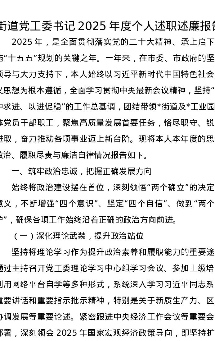 街道党工委书记2025年度个人述职述廉报告