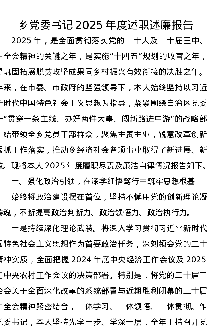 乡党委书记2025年度述职述廉报告