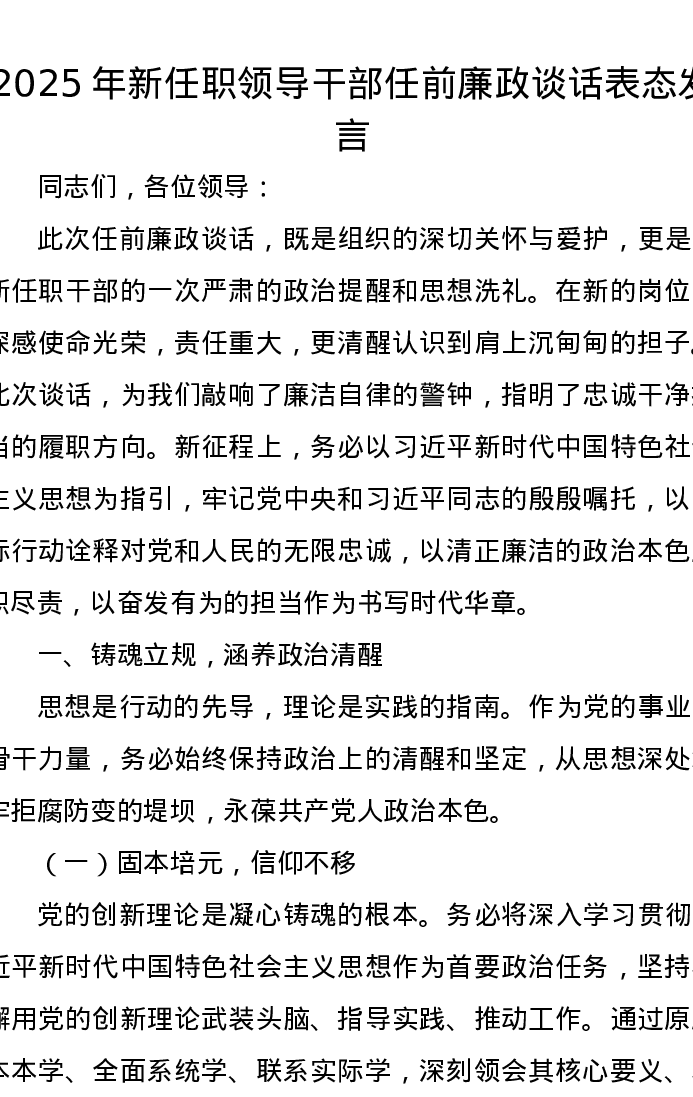 2025年新任职领导干部任前廉政谈话表态发言