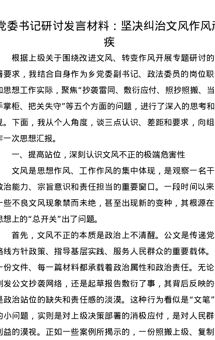 党委书记研讨发言材料:坚决纠治文风作风顽疾
