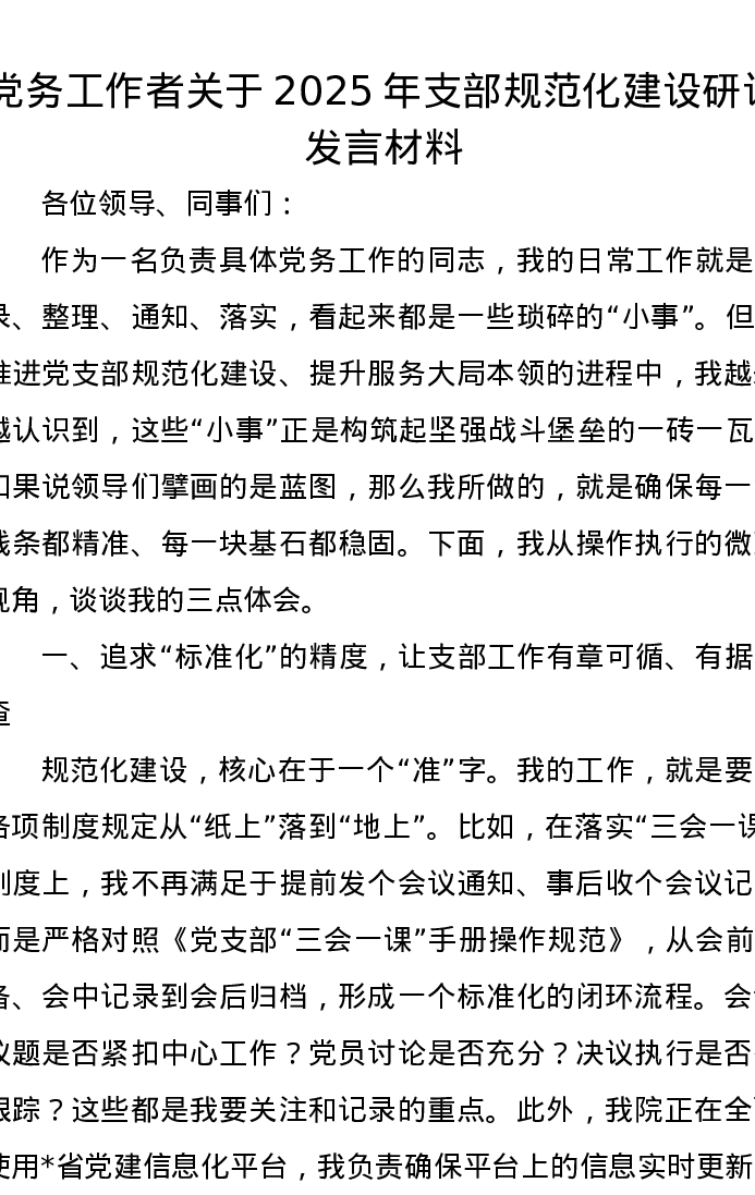 党务工作者关于2025年支部规范化建设研讨发言材料