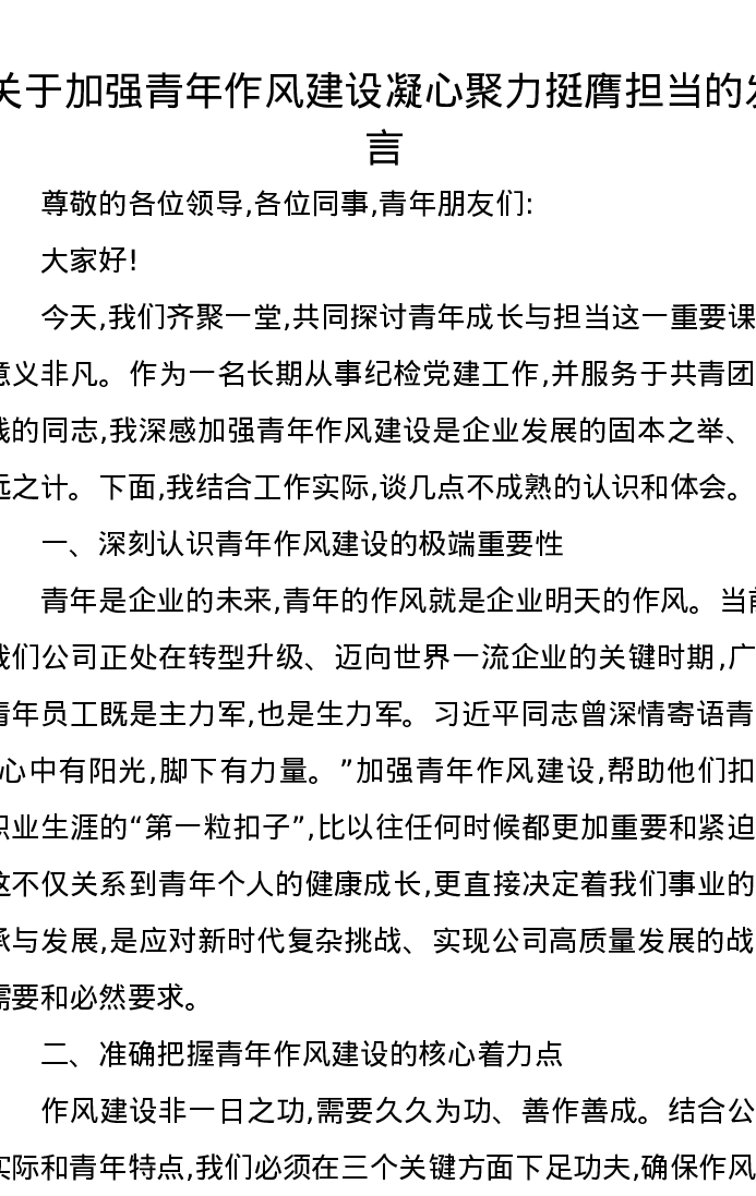 关于加强青年作风建设凝心聚力挺膺担当的发言
