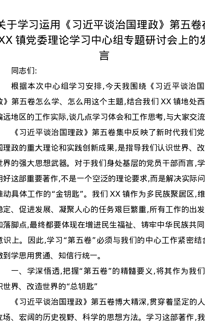 关于学习运用《习近平谈治国理政》第五卷在XX镇党委理论学习中心组专题研讨会上的发言