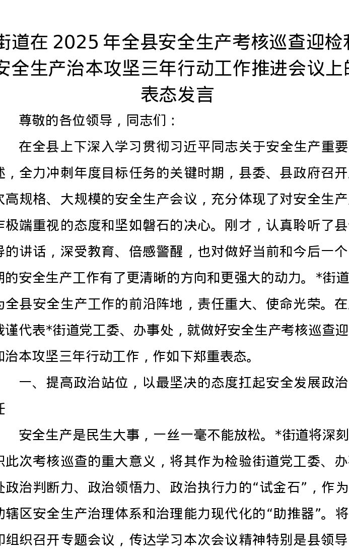 街道在2025年全县安全生产考核巡查迎检和安全生产治本攻坚三年行动工作推进会议上的表态发言