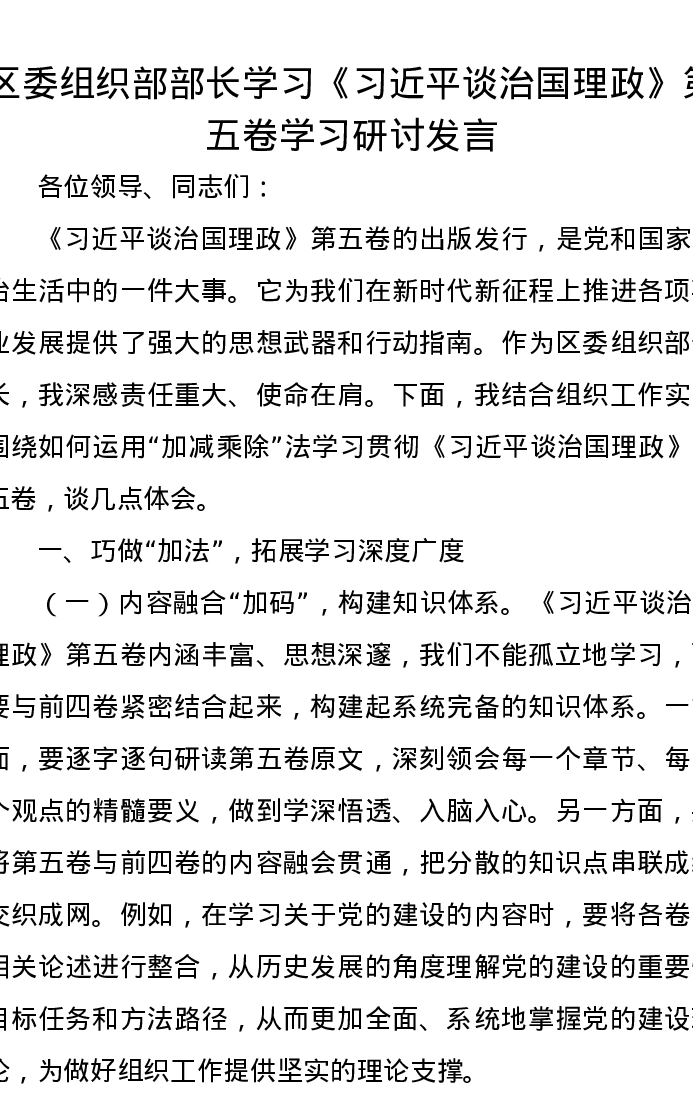 区委组织部部长学习《习近平谈治国理政》第五卷学习研讨发言