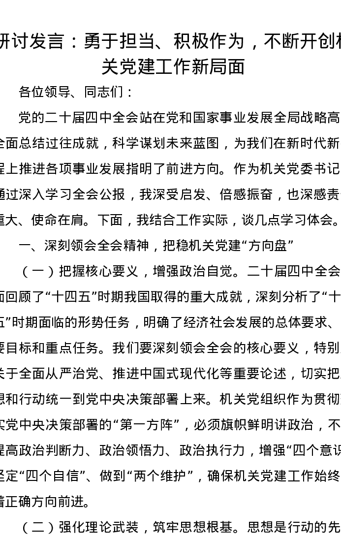 研讨发言:勇于担当、积极作为,不断开创机关党建工作新局面