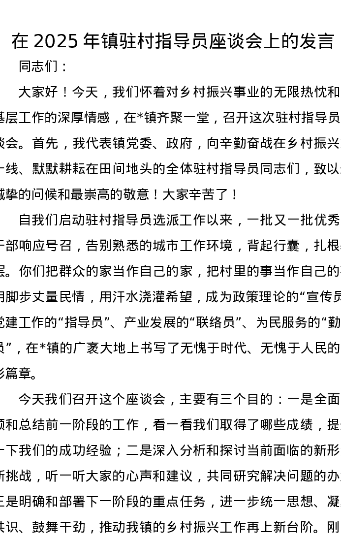 在2025年镇驻村指导员座谈会上的发言