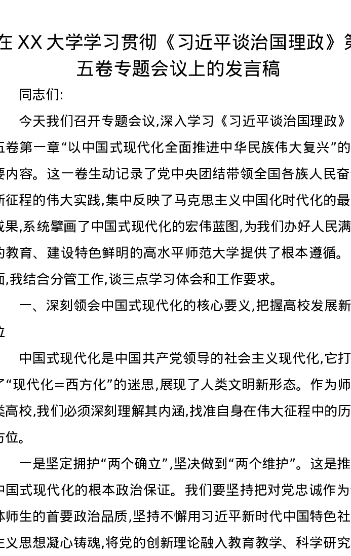 在XX大学学习贯彻《习近平谈治国理政》第五卷专题会议上的发言稿