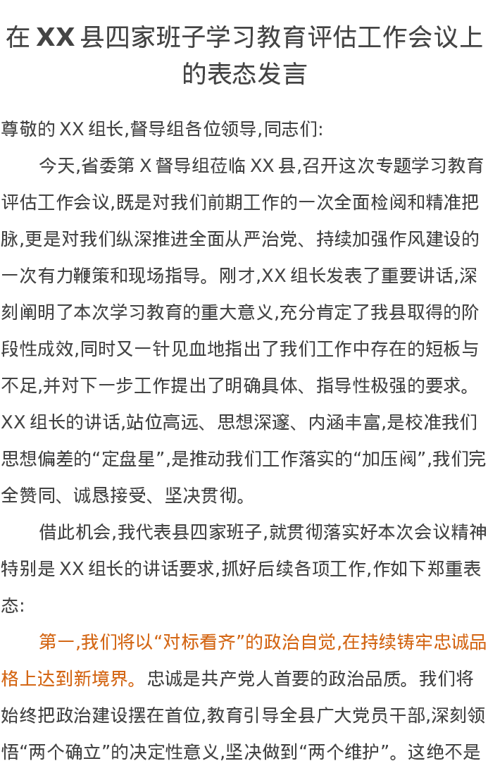 在XX县四家班子学习教育评估工作会议上的表态发言