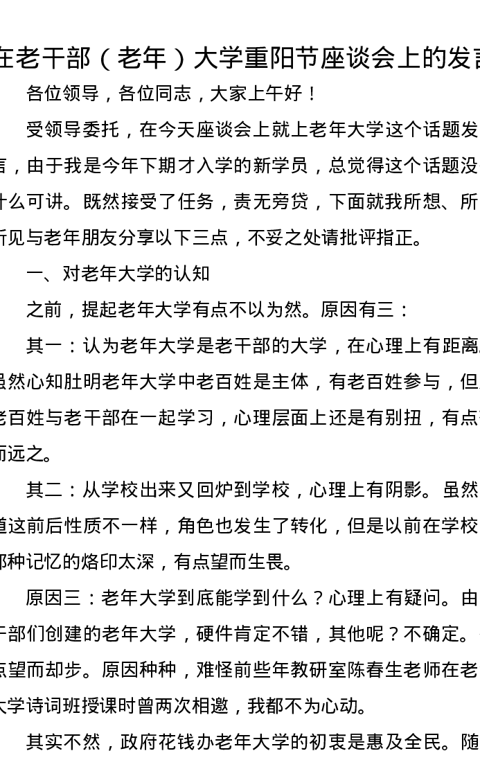 在老干部(老年)大学重阳节座谈会上的发言