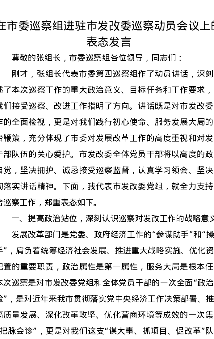 在市委巡察组进驻市发改委巡察动员会议上的表态发言