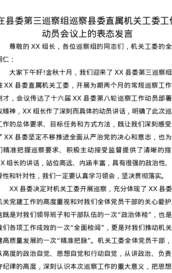 在县委第三巡察组巡察县委直属机关工委工作动员会议上的表态发言