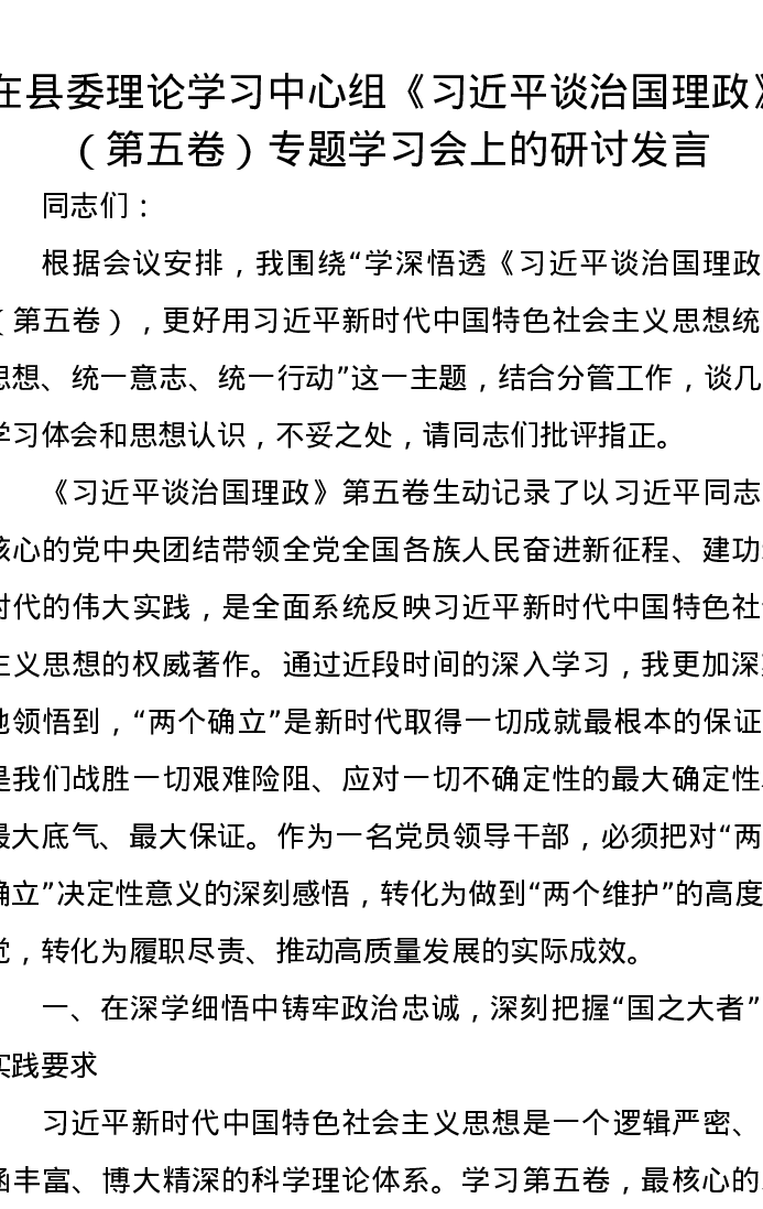 在县委理论学习中心组《习近平谈治国理政》(第五卷)专题学习会上的研讨发言