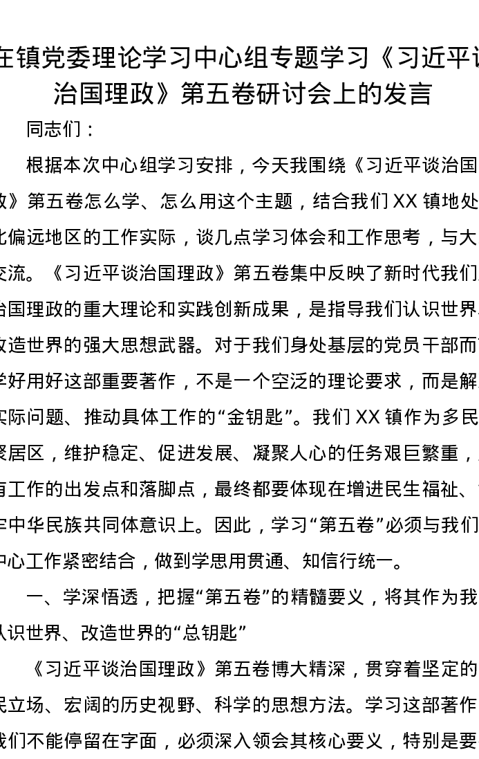 在镇党委理论学习中心组专题学习《习近平谈治国理政》第五卷研讨会上的发言