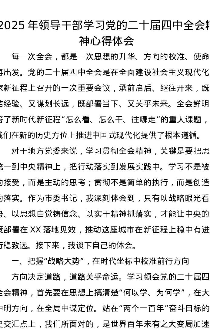 2025年领导干部学习党的二十届四中全会精神心得体会
