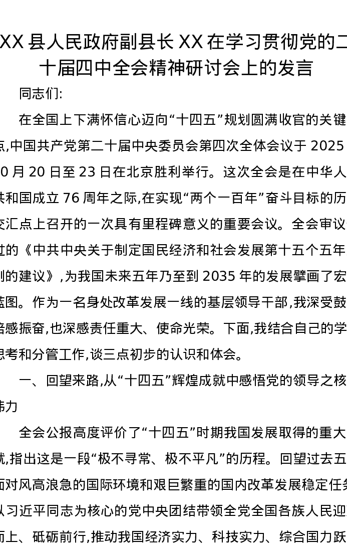 XX县人民政府副县长XX在学习贯彻党的二十届四中全会精神研讨会上的发言