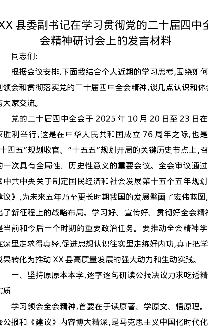XX县委副书记在学习贯彻党的二十届四中全会精神研讨会上的发言材料2