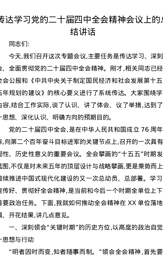 传达学习党的二十届四中全会精神会议上的总结讲话