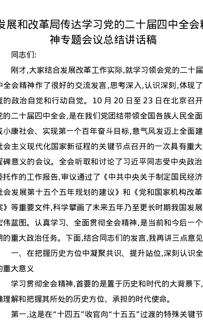 发展和改革局传达学习党的二十届四中全会精神专题会议总结讲话稿