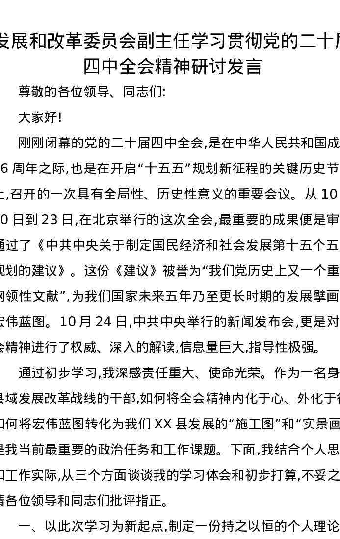 发展和改革委员会副主任学习贯彻党的二十届四中全会精神研讨发言