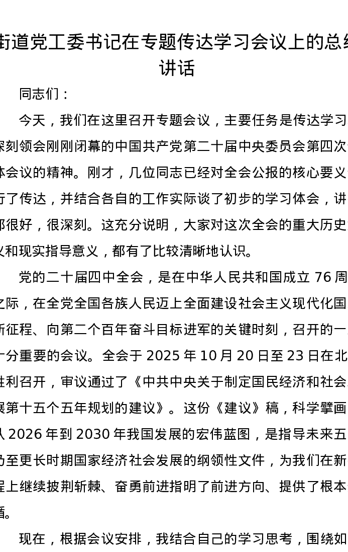 街道党工委书记在专题传达二十届四中全会精神学习会议上的总结讲话