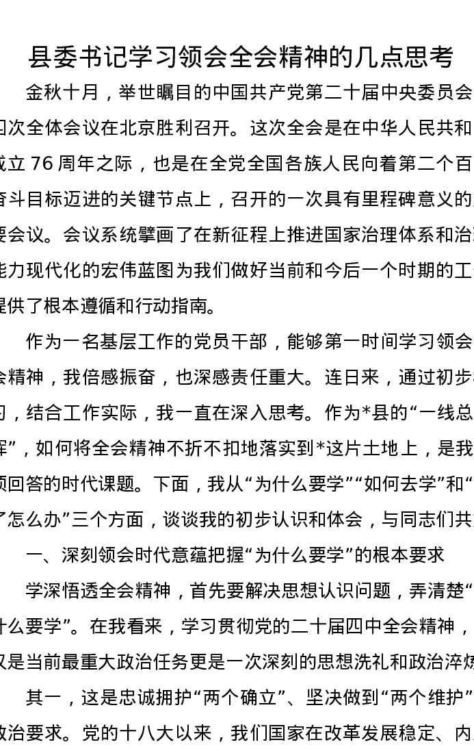 县委书记学习领会四中全会精神的几点思考
