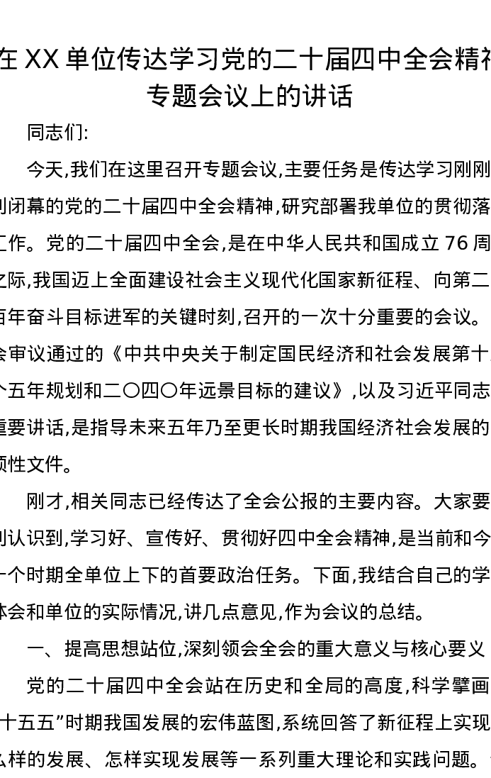 在XX单位传达学习党的二十届四中全会精神专题会议上的讲话