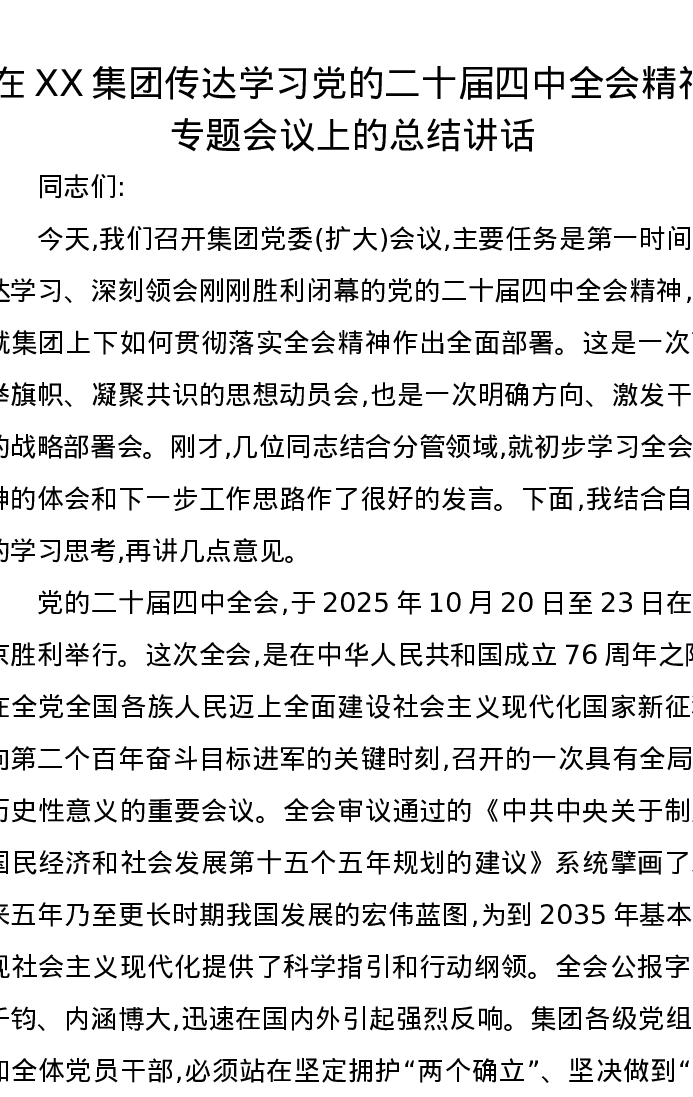 在XX集团传达学习党的二十届四中全会精神专题会议上的总结讲话