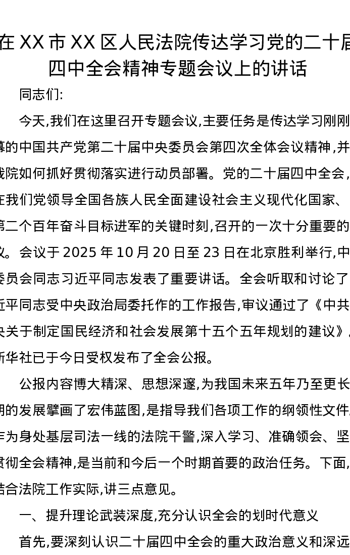 在XX市XX区人民法院传达学习党的二十届四中全会精神专题会议上的讲话