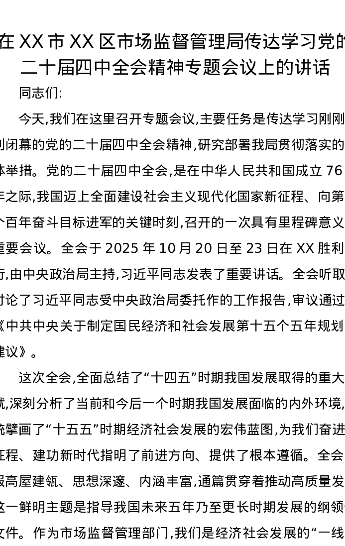在XX市XX区市场监督管理局传达学习党的二十届四中全会精神专题会议上的讲话