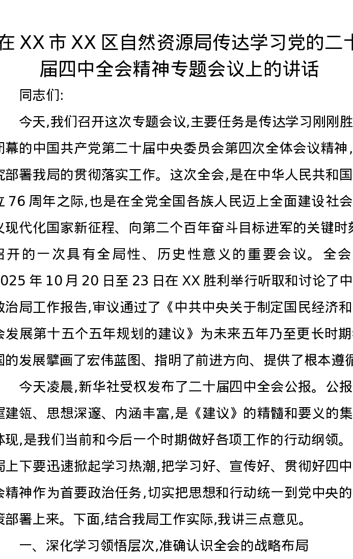 在XX市XX区自然资源局传达学习党的二十届四中全会精神专题会议上的讲话