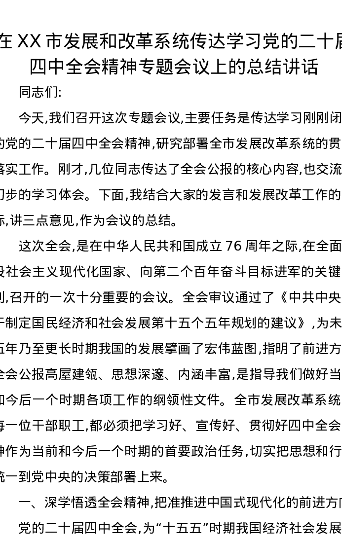 在XX市发展和改革系统传达学习党的二十届四中全会精神专题会议上的总结讲话