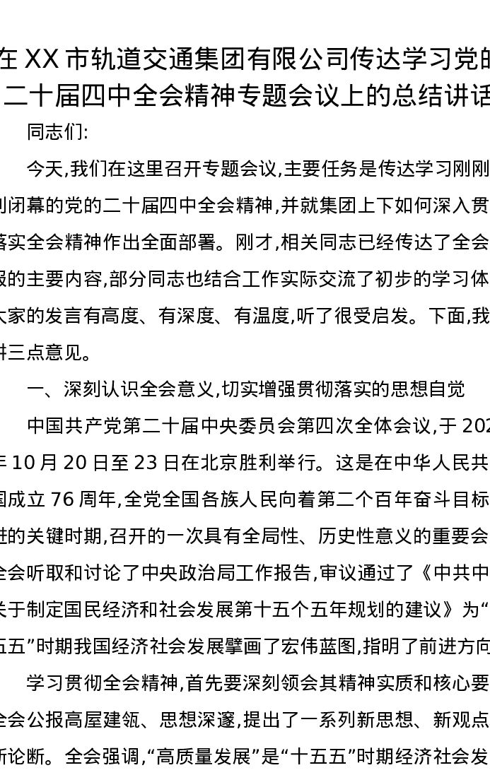 在XX市轨道交通集团有限公司传达学习党的二十届四中全会精神专题会议上的总结讲话
