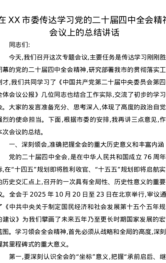 在XX市委传达学习党的二十届四中全会精神会议上的总结讲话