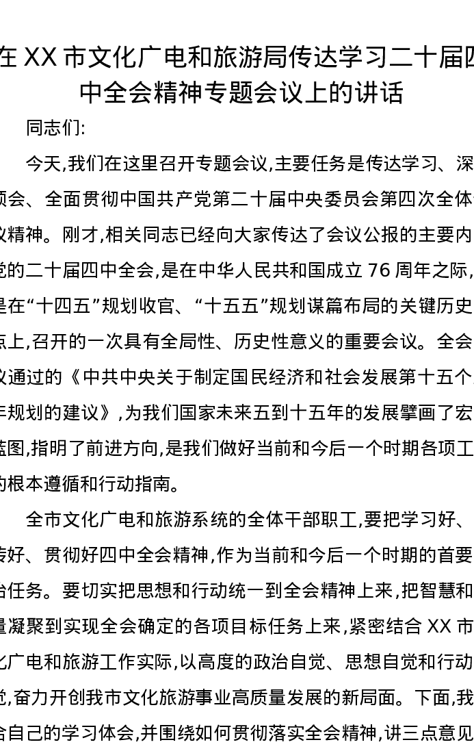 在XX市文化广电和旅游局传达学习二十届四中全会精神专题会议上的讲话