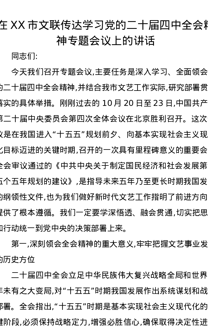 在XX市文联传达学习党的二十届四中全会精神专题会议上的讲话