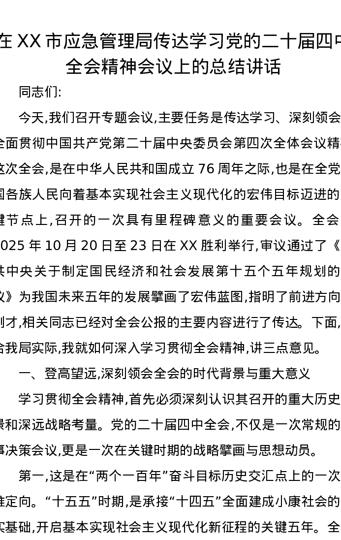 在XX市应急管理局传达学习党的二十届四中全会精神会议上的总结讲话