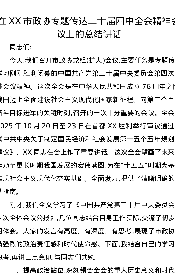 在XX市政协专题传达二十届四中全会精神会议上的总结讲话