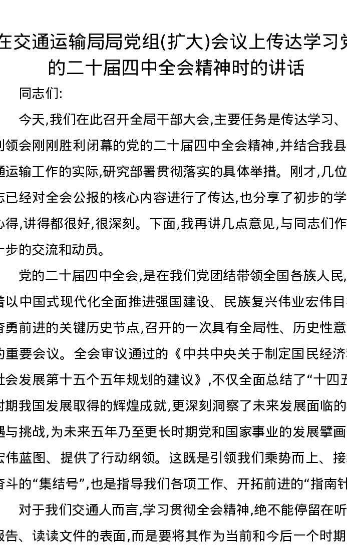 在交通运输局局党组(扩大)会议上传达学习党的二十届四中全会精神时的讲话