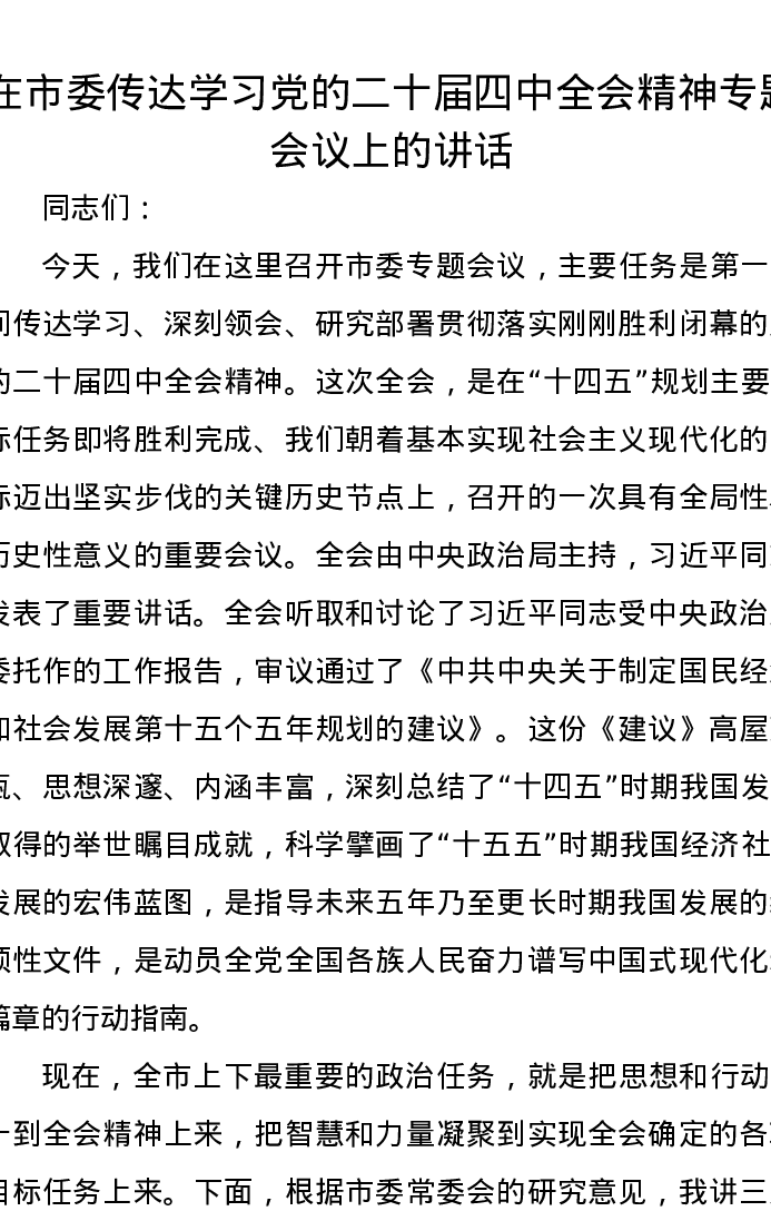 在市委传达学习党的二十届四中全会精神专题会议上的讲话