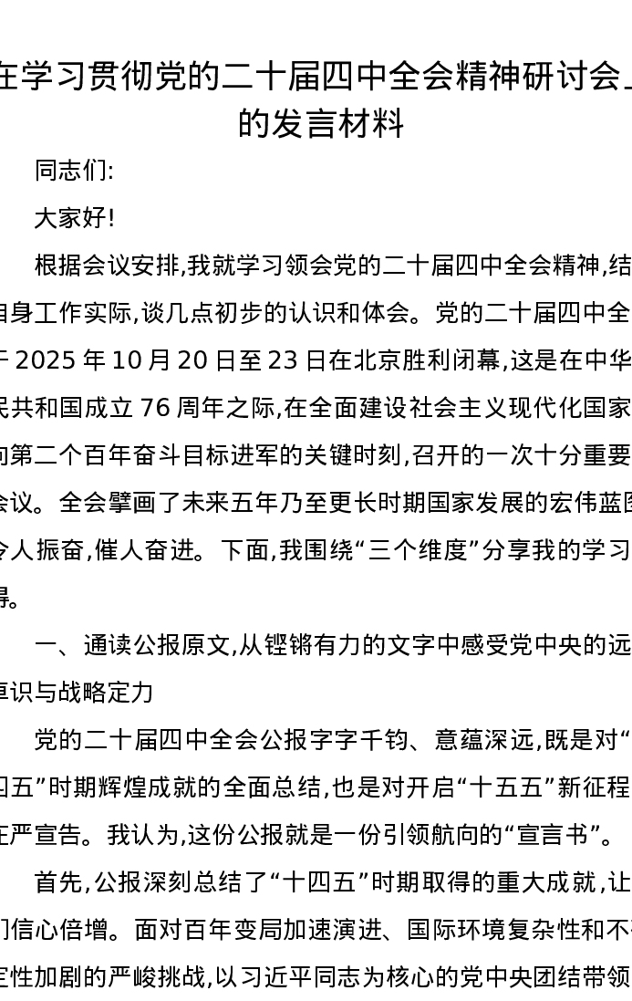 在学习贯彻党的二十届四中全会精神研讨会上的发言材料