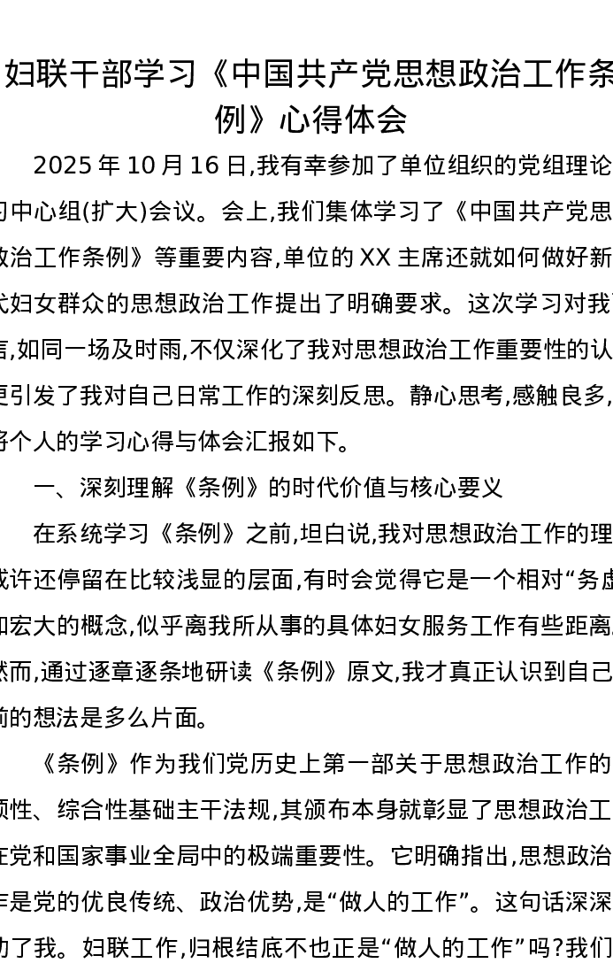 妇联干部学习《中国共产党思想政治工作条例》心得体会